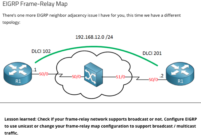 NBMA: Non Broadcast Multi Access networks like frame-relay will not allow broadcast or multicast traffic by default. This can prevent EIGRP from forming EIGRP neighbor adjacencies.