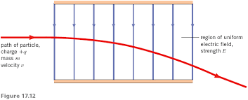 Describe the motion of a positive charged particle moving perpendicular to a uniform electric field.