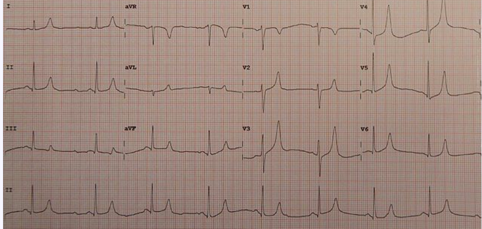 This patient’s ECG is remarkable for tall, “peaked” T-waves in the anterior and lateral precordial leads (V3-V6). Tall T-waves are a typical ECG finding in hyperkalemia and can occur with serum potassium greater than 5.5 mEq/L (normal 3.5-5).