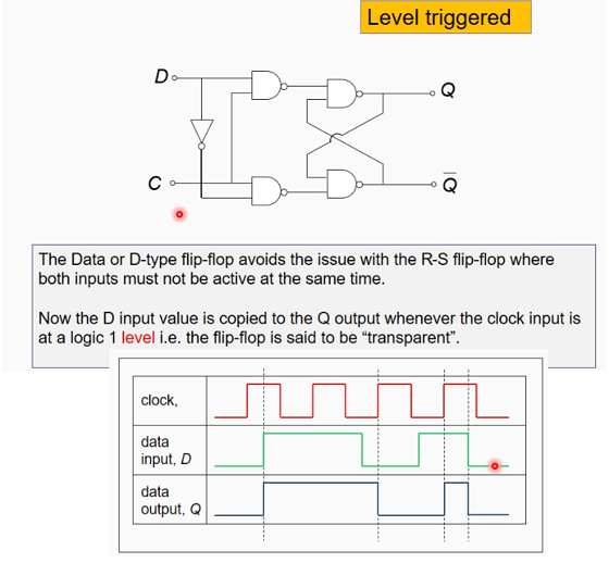 * Now the D input value is copied to the Q output whenever the clock input is at a logic 1 level. This means the flip-flop is said to be ‘Transparent’ where it can only copy the data when the clock is active.