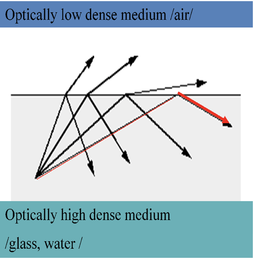 Further increase of the angle of incidence causes complete return of the light in the first glass medium (the angle of refraction acquire a value bigger than 90 degree).