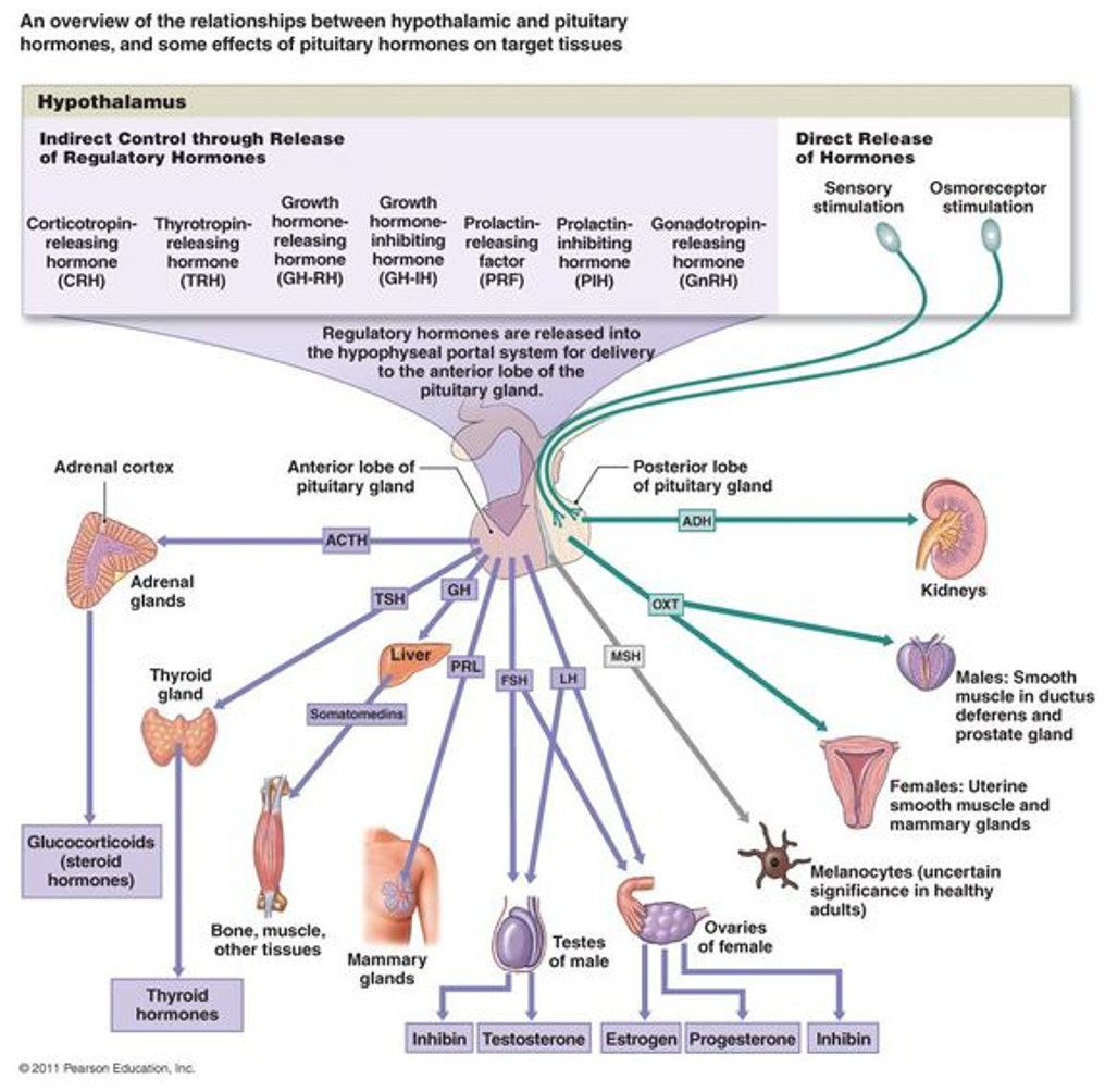 It has two lobes (anterior and posterior). The anterior pituitary gland produces hormones that directly regulate the target organs (e.g., ovaries, testes, thyroid, adrenals).