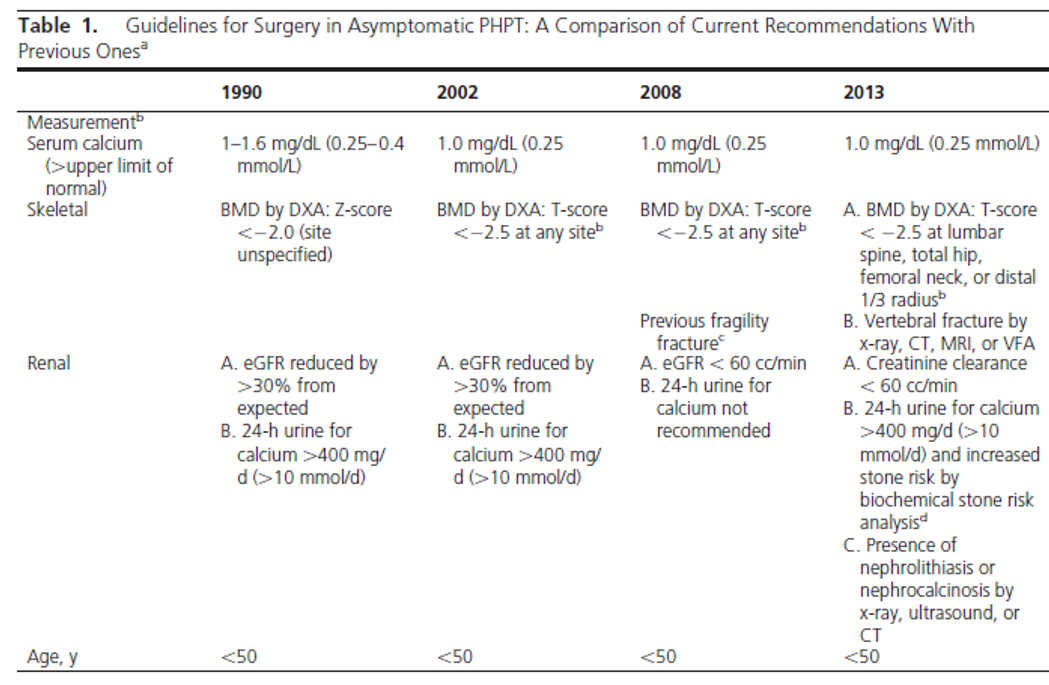 (1) recommended for pts <50yo with clinically significant hypercalcemia, osteoporosis or fragility fracture, renal calculi, hypercalciuria, impaired renal function