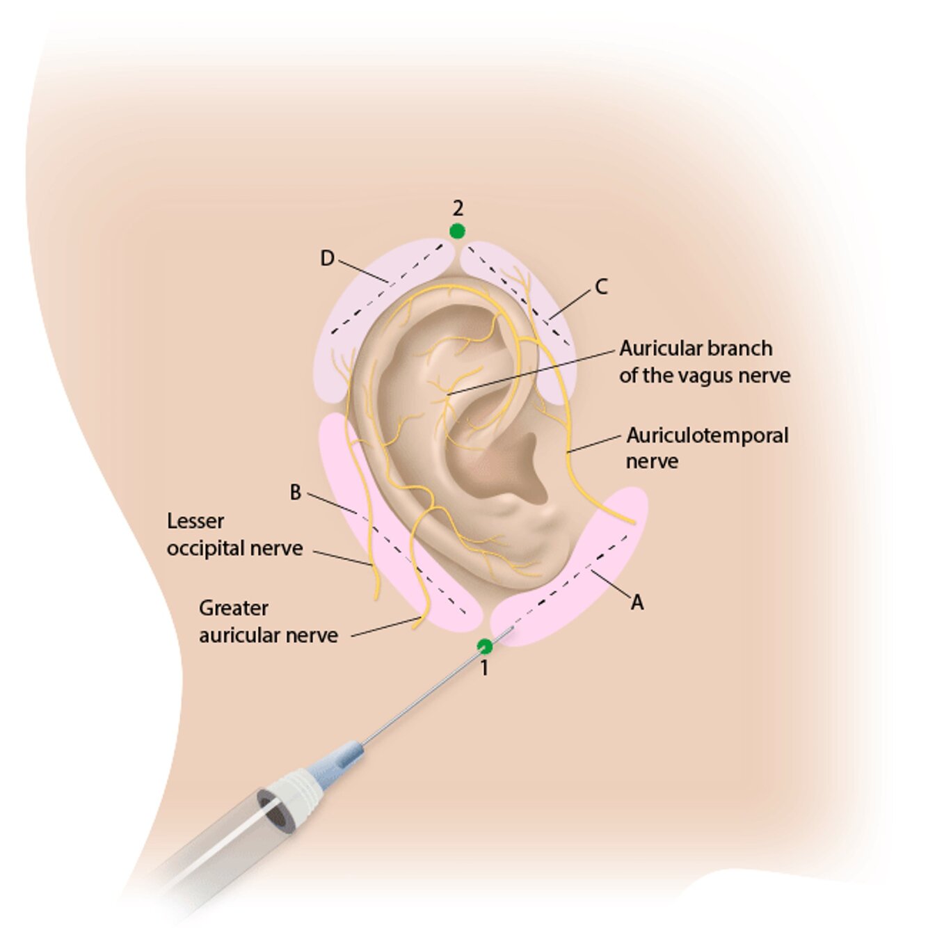 Enter the skin at a point below the ear and advance the needle posteriorly over the mastoid behind the ear.