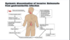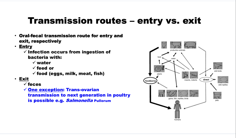 What are the routes of transmission for Salmonella? What is entry? What is exit?
