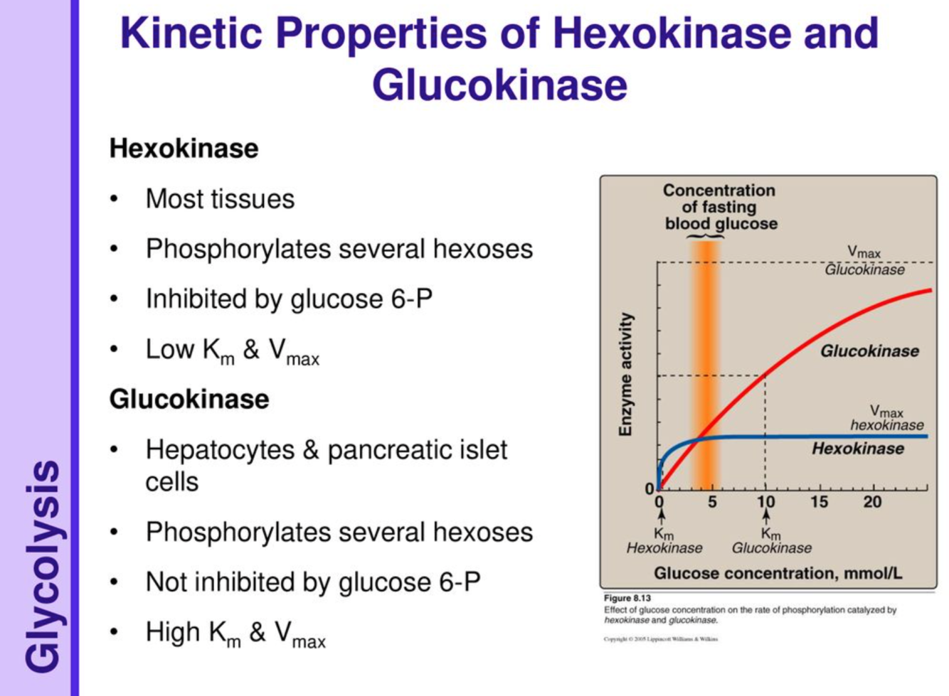 What kinetic properties do glucokinase and hexokinase have (KM and vmax)