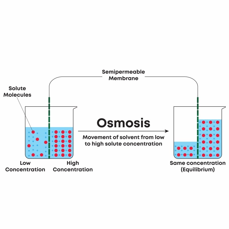 The movement of water across a selectively permeable membrane from lower solute (higher water potential) to higher solute (lower water potential).