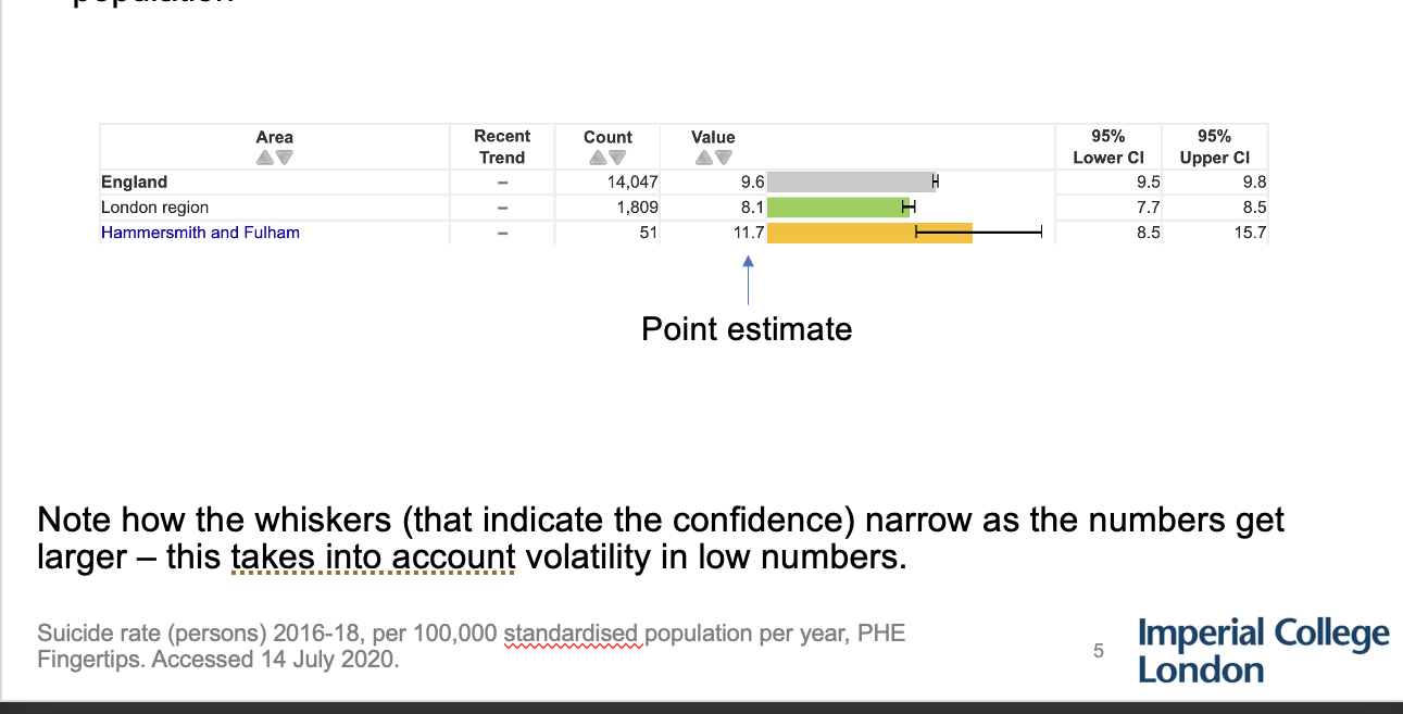 eg. For Hammersmith and Fulham, we think the suicide rate per year is 11.7 per 100000 and we are 95% confident the value lies between 8.5 and 15.7%