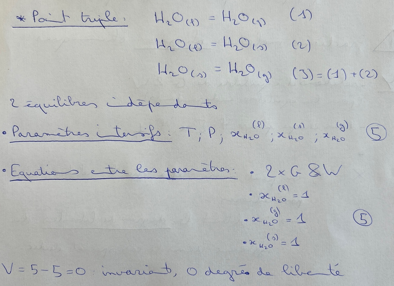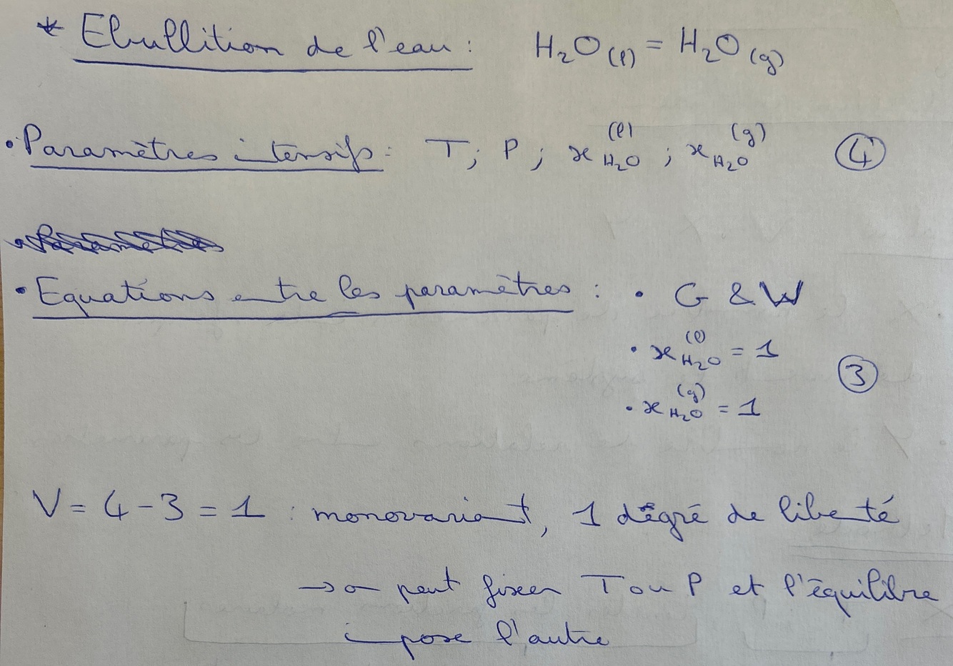 Ces paramètres intensifs ne sont pas tous indépendants : il existe des relations entre eux. (Par exemple à une pression fixée, l’équilibre impose la température d’ébullition, ou alors le point triple, l’équilibre impose la température et la pression)