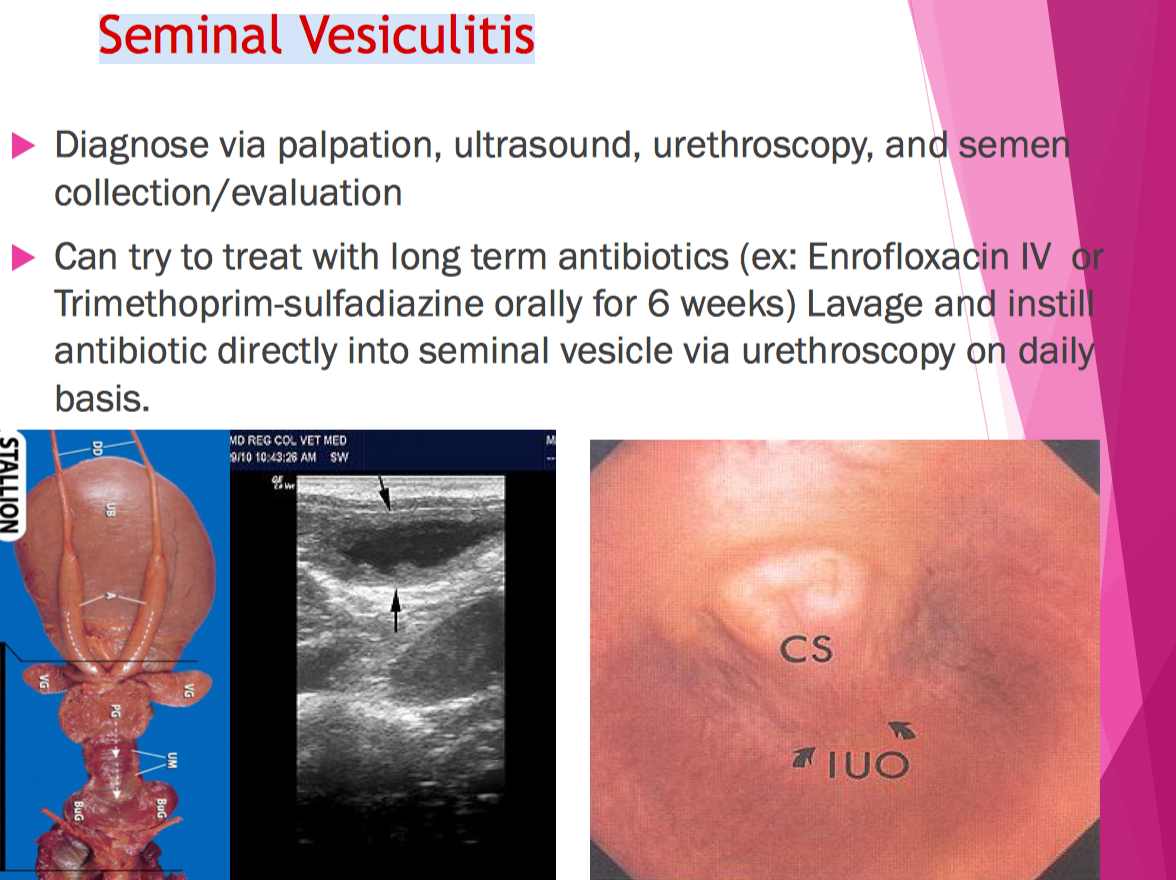 Seminal vesiculitis (inflammation of the seminal vesicles) is a cause of pyospermia in stallions. Diagnose via palpation, ultrasound, urethroscopy, and semen collection/evaluation. Treat with Enrofloxacin IV or Trimethoprim-sulfadiazine orally for 6 weeks
