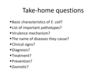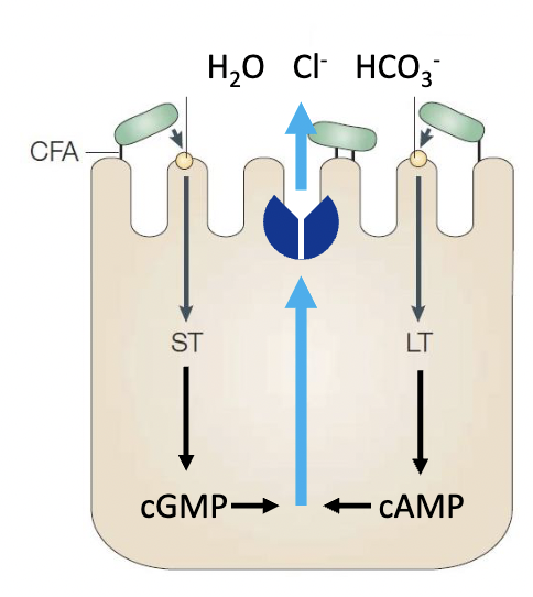 Regulate absoprtion and secretion in villus epithelial cells. Pump out etaer nad bicarb while inhibitng fluid absorption from intestine. –> Lt and ST produced. Imbalance in ion and cell excretes water –> water diarrhea