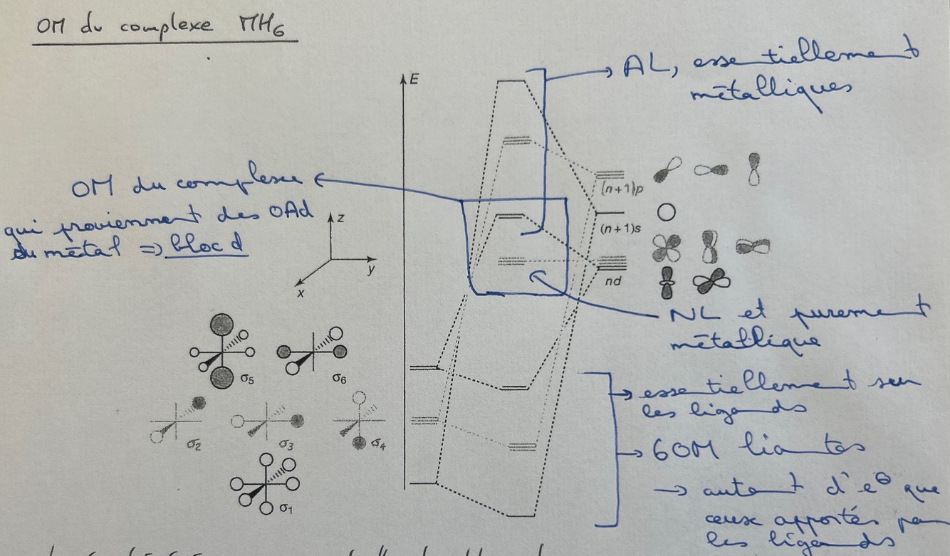 Les OA qui n’intéragissent pas sont celles du métal qui pointent entre les ligands (les 3 non liantes)
