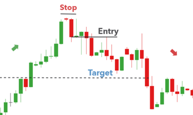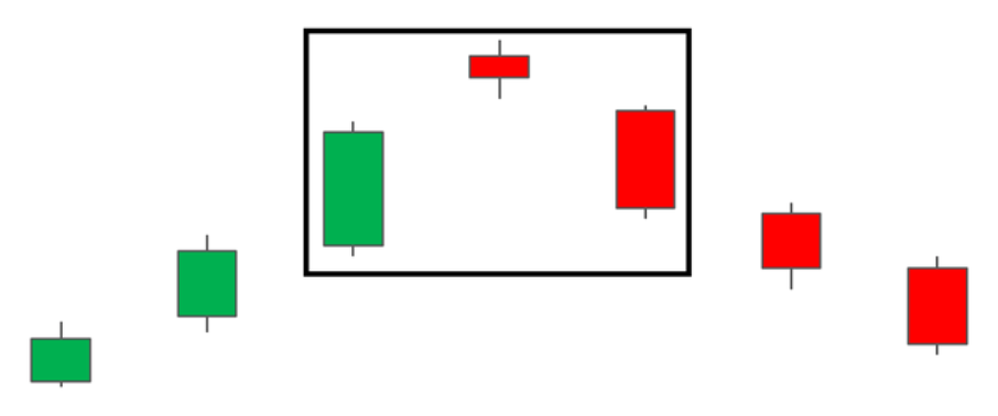 The third Candle shows a large red candle that opens at a price below the previous Candle and then closes near the middle of the first Candle.