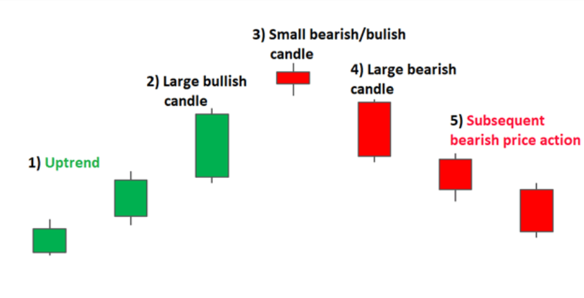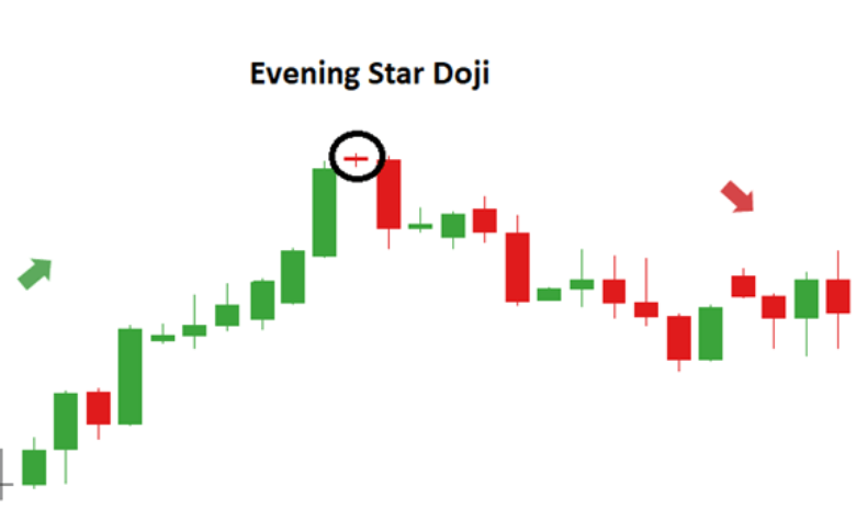 An evening star is a bearish stock-price chart pattern consisting of three candles: a large green candlestick, a small-bodied candle, and a red candle.