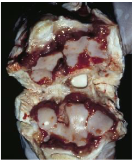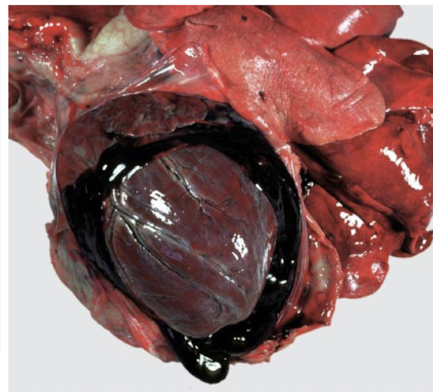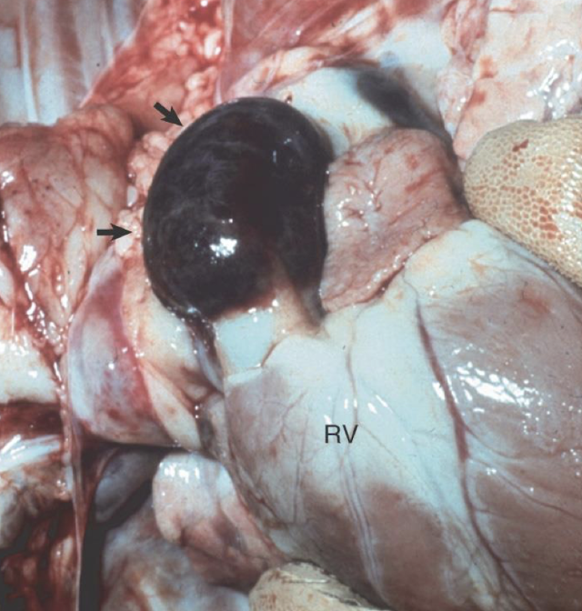• Hemangiosarcoma -> sometimes in the right atrium. This will create cystic lesions filled with blood and can just collapse and die. Death is attributed to rupture of R atrium and blood build up in pericardial sac and then tamponade which lead to death.