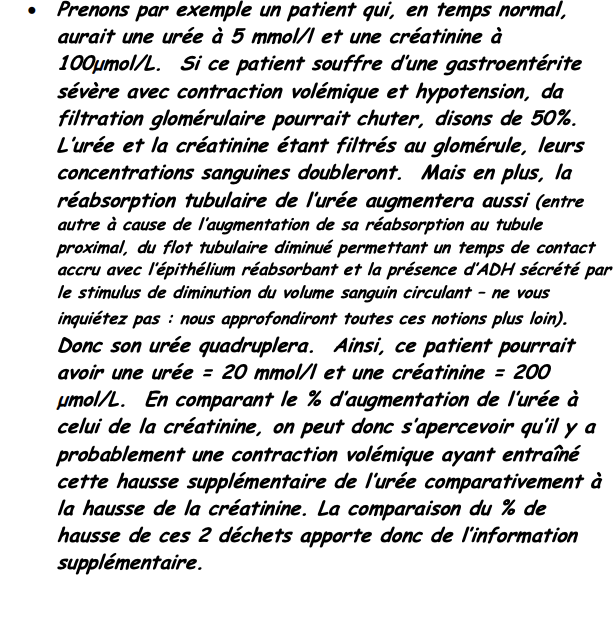 urée : variable (dépend de la filtration glomérulaire et d’une réabsorption tubulaire variable selon l’état volémique, incluant au le niveau d’ADH)