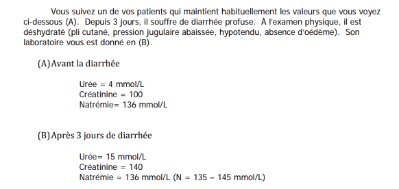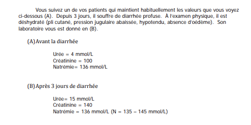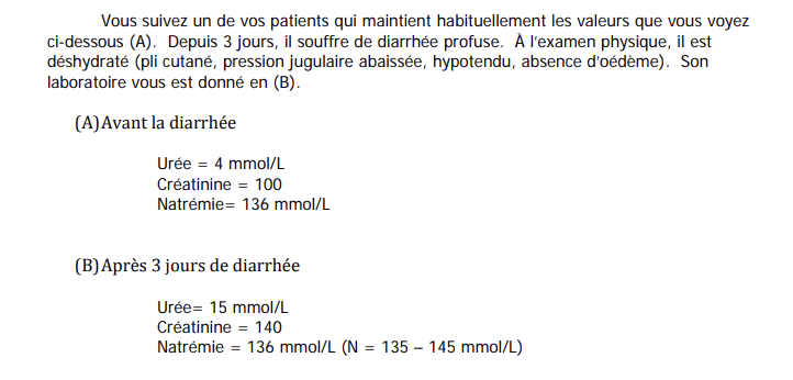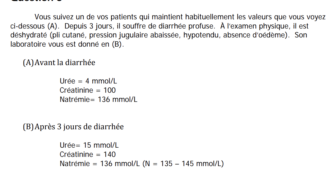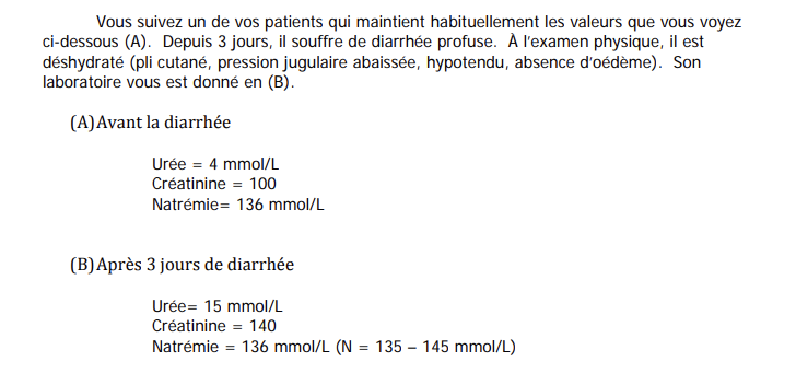 ici, l’examen physique démontre qu’il y a perte de volume intravasculaire (pression, jugulaire abaissée, hypotension) et interstitiel (pli cutané, absence d’oedème)