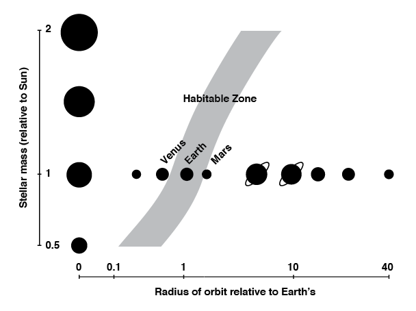 Draw a graph to describe how the mass of a star affects the habitable zone.