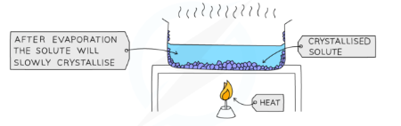 The solution is heated, allowing the solvent to evaporate to leave a saturated solution behind.