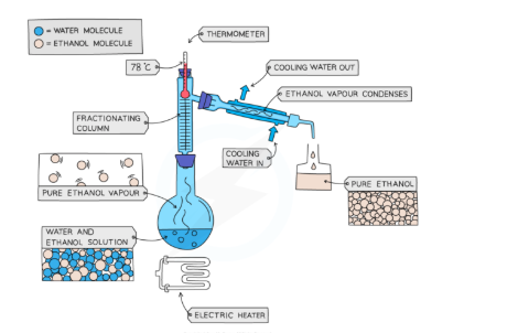 For water and ethanol: ethanol has a boiling point of 78 ºC and water of 100 ºC. The mixture is heated until it reaches 78 ºC, at which point the ethanol boils and distills out of the mixture and condenses into the beaker.