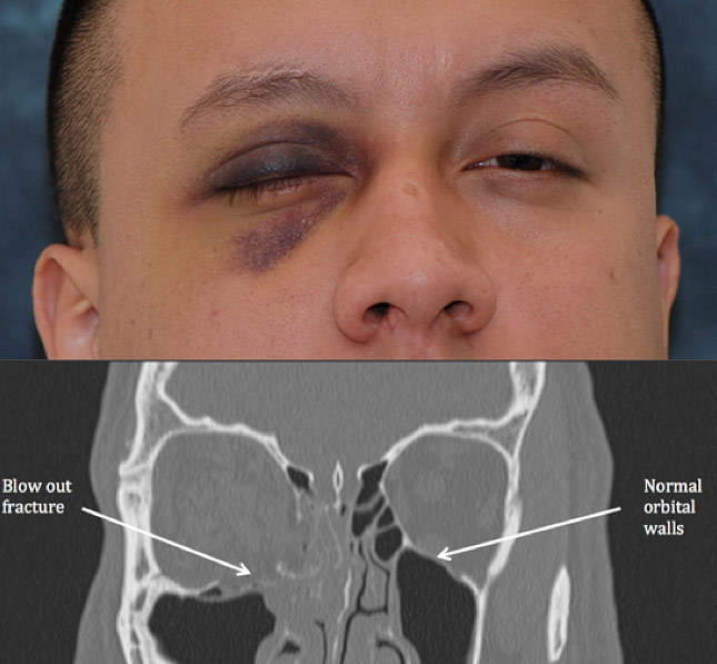 Orbital floor “blow out” fracture = orbital floor (maxillary, zygomatic, palatine) due blunt force trauma to the globe/infra-orbital rim.