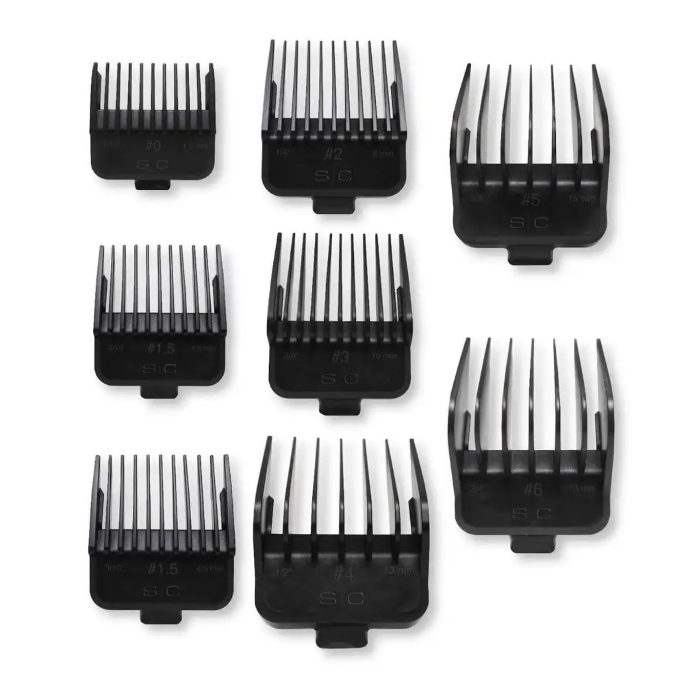 Plastic or hard rubber comb attachments that fits over clipper blades to minimize the amount of hair being cut by the clippers; or metal shields applied over a hair cutting razor for protection.