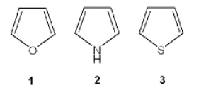 B. 1 = thiophene; 2 = furan; 3 = pyrrole