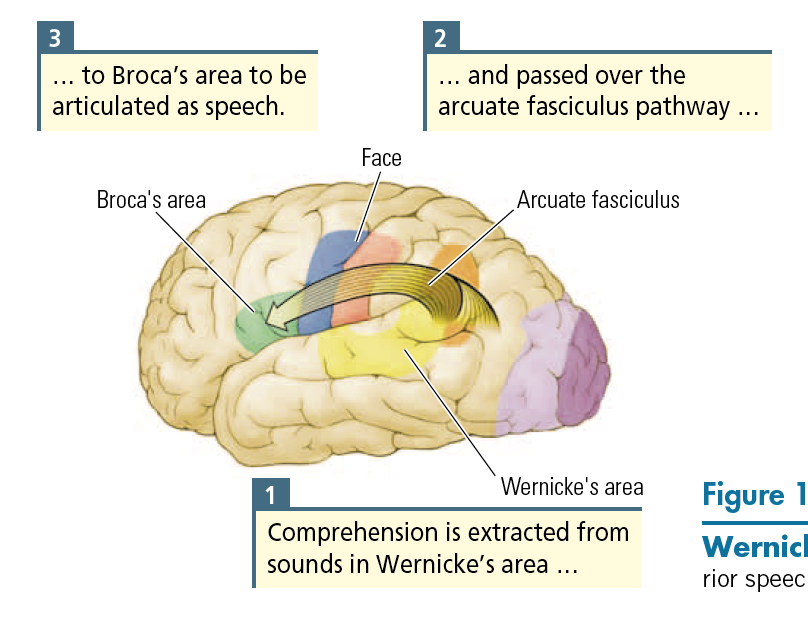 Draw the Wernicke-Geschwind Model of Language, label each primary area (Broca’s, Wernicke’s, Arcuate Fasciculus, Primary Motor Cortex) and the associated function of each area.