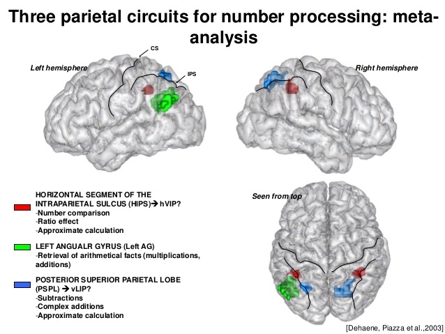 Name two areas of the brain involved in arithmetic and describe their functions.