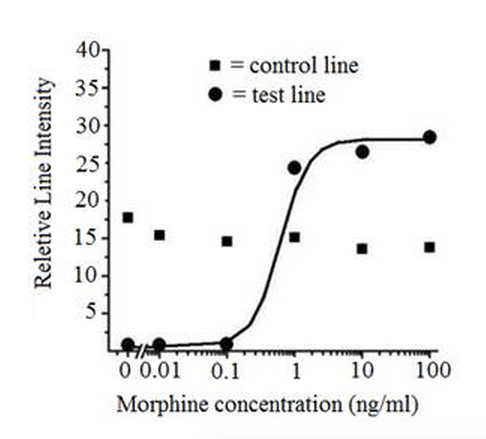 In which concentration range would the paper-based lateral-flow test strip be most effective as a quantitative tool for predicting blood morphine levels based on test line intensity?