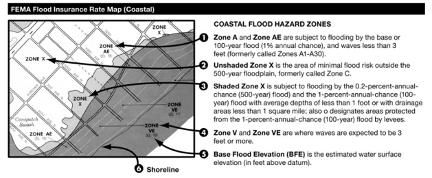The computed elevation to which floodwater is anticipated to rise during a 100-year flood as formally defined by the Federal Emergency Management Agency (i.e. areas with a 1% annual chance of flooding). Note that in this usage, “100-year flood” does not mean “once every 100 years”; a particular location could experience two 100-year floods in the same year or even five 100-year floods over the course of 100 years, or not at all for 200 years or more.