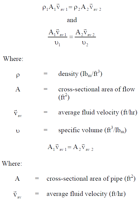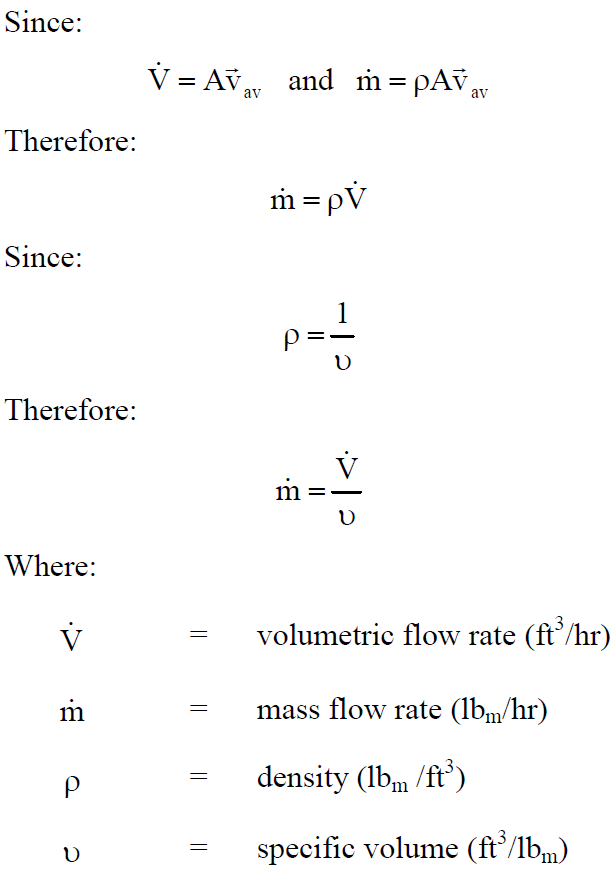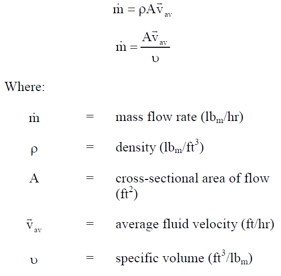 The mass flow rate equals the product of the density of the fluid, the cross-sectional area of flow, and average velocity of the fluid. If specific volume is used, mass flow rate is equal to the product of cross-sectional area and average velocity divided by the specific volume of the fluid.