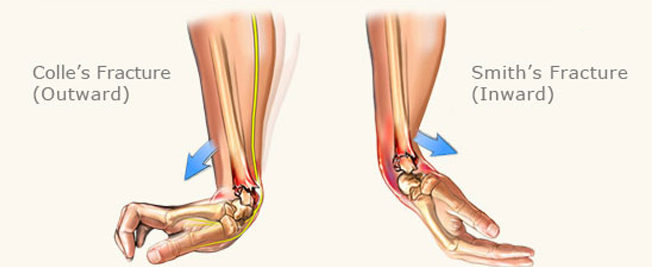 A Smith’s fracture involves a volarly displaced distal radius, whereas a Colles’ involves a dorsally displaced distal radius