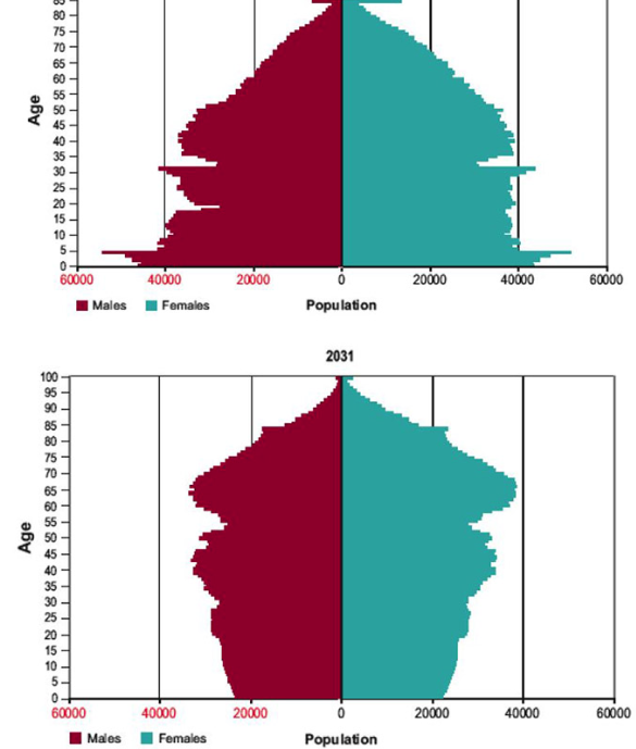 Health services - Increased numbers of geriatricians and allied health professionals required, increased wards/health care facilities for elderly health care, increased prevalence long-term conditions such as diabetes, CVD, renal disease, need for specific health promotion campaigns aimed at elderly.