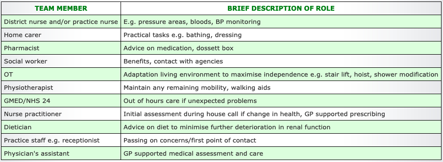 Several members of the multi-professional team are involved in Jean’s care. List five team members other than the GP and give a brief description of their role in relation to Jean’s care.