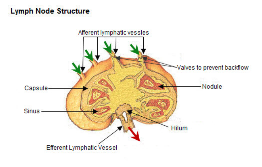 <ol> <li>Lymph</li> <li>Afferent vessel</li> <li>Lymph node</li> <li>Efferent vessel (filtered lymph)</li> <li>Lymphatic duct</li> <li>Venous system</li> <li>Blood</li></ol>
