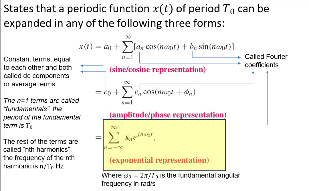 A periodic function can be expanded in terms of fundamentals and nth harmonics, with coefficients representing the function’s frequency content.