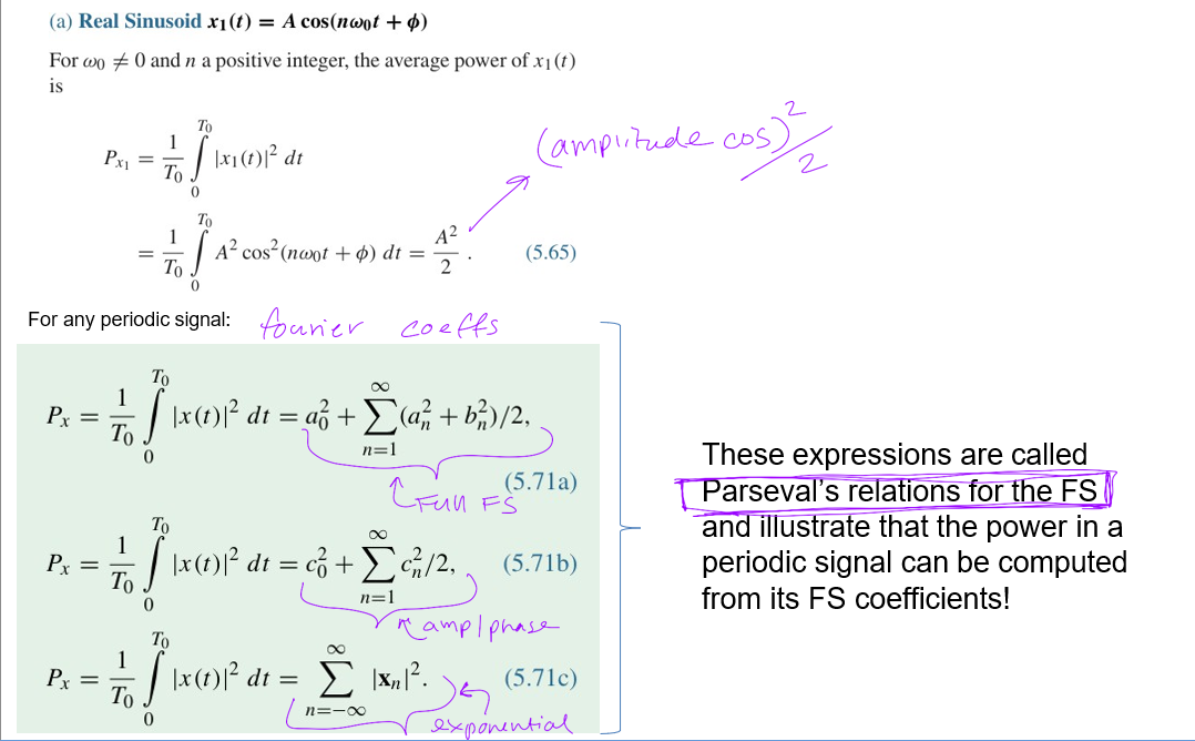 Expressions that illustrate that the power in a periodic signal can be computed from its Fourier Series coefficients.