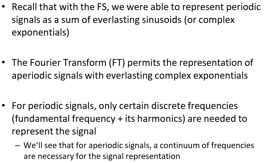 Unlike Fourier Series, FT is applicable for non-repeating signals.