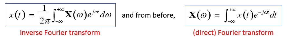 Given by ( X(omega) = int x(t) e^{-j omega t} dt ).