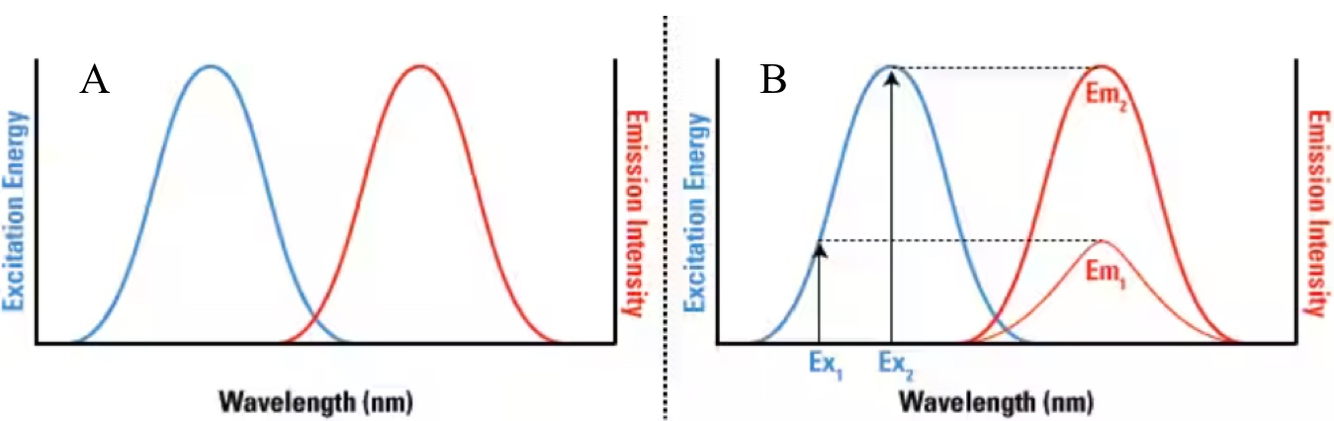 Emission wavelength is proportional to the amplitude of the excitation wavelength