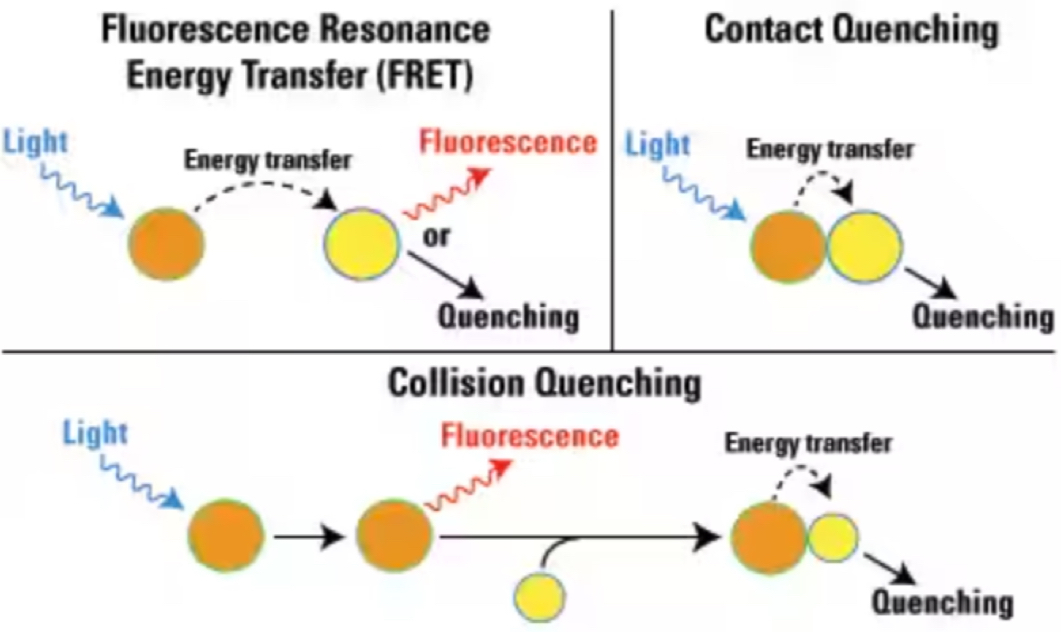 What does the diagram of FRET, contact quenching and collision quenching look like?