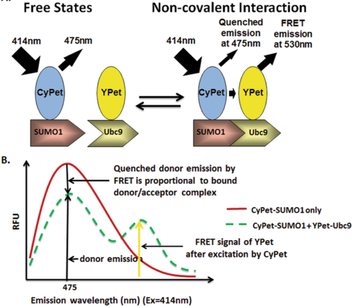 Explain how FRET can be used to analyse the interaction between SUMO1 and Ubc9