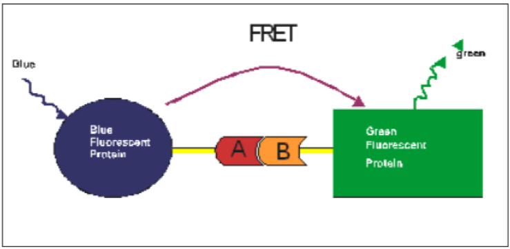 Draw a diagram showing how protein protein interaction can be detected using FRET and proteins tagged with Green Fluorescent Protein (GFP) and blue (BFP)