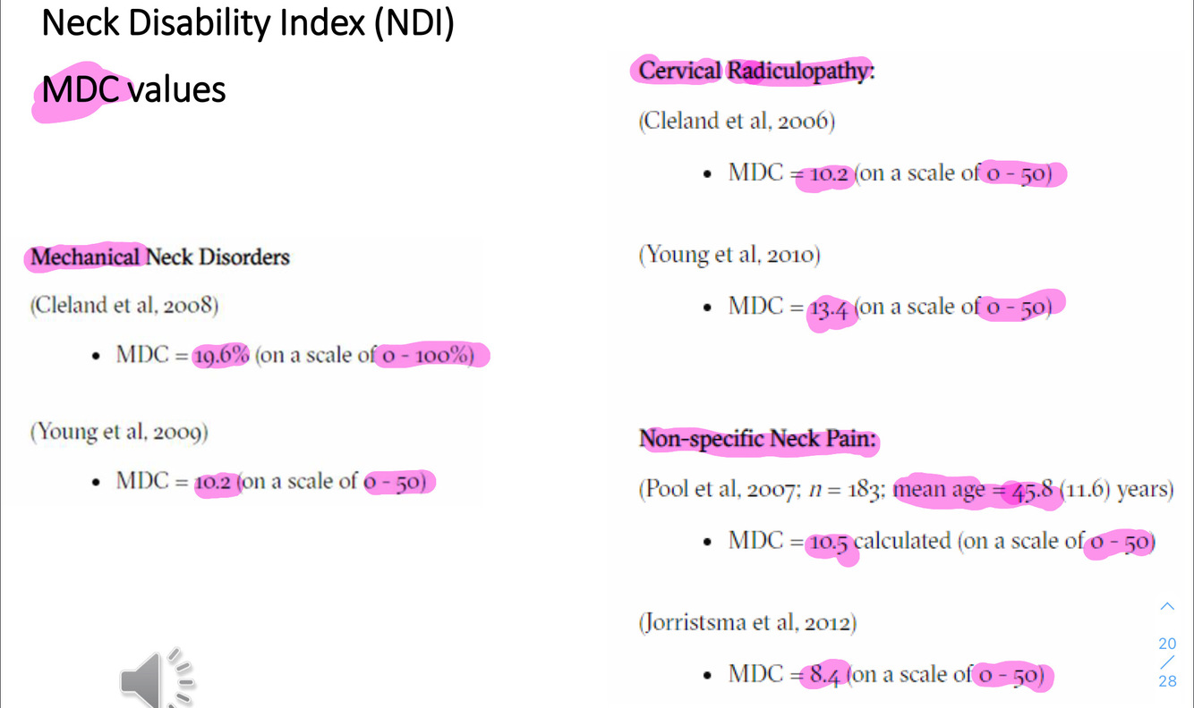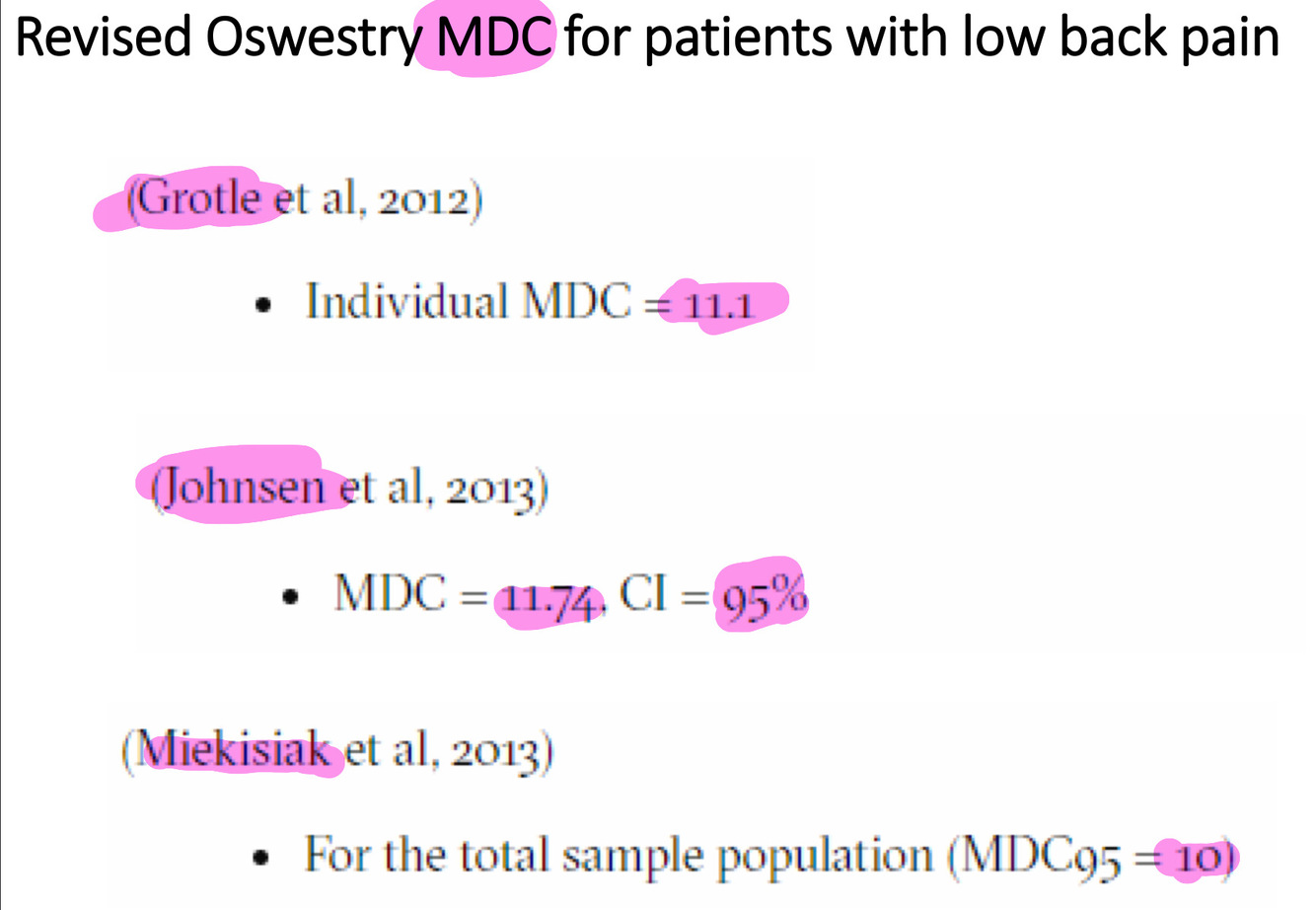 *NOTE: When you know the MDC (95% CB) of a SRO tool, you can be reasonably confident that the pt has truly improved (or worsened) if their follow-up score has changed by the MDC value or more.