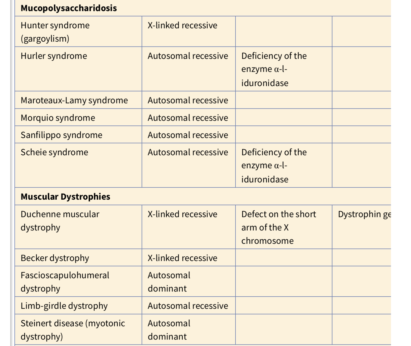 Muchopolysaccharidosis table: