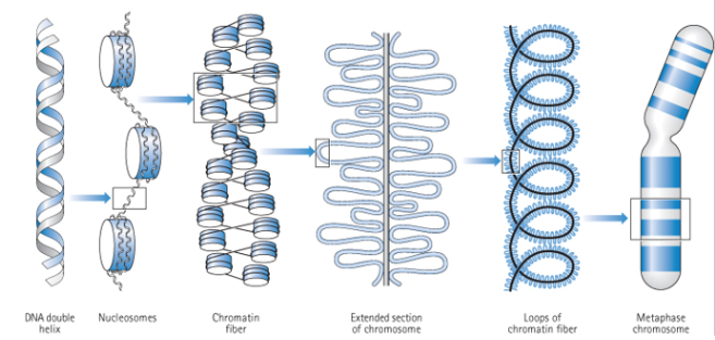 Formation of the nucleosome is the first level of DNA packaging. Describe the the steps involved in the other levels of DNA packaing which result in the formation of the chromosome.