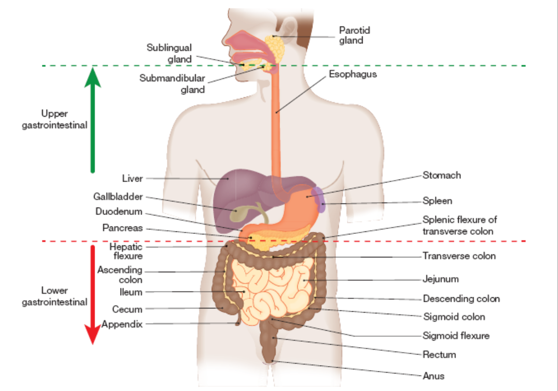 Esophagus → stomach (hydrochloric acid, intrinsic factor) → duodenum (bile, amylase, lipase) → jejunum → ileum → cecum → ascending colon → transverse colon → descending colon → sigmoid colon → rectum → anus