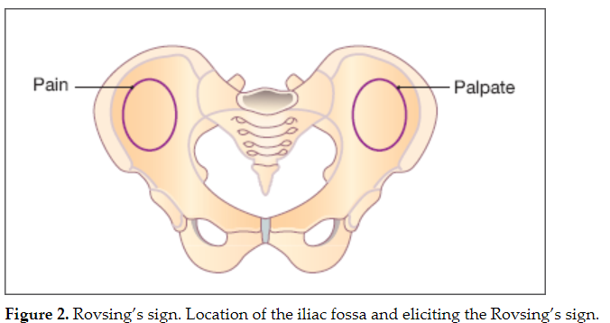 Rovsing’s sign is the finding of right lower quadrant pain during palpation of the left side of the abdomen or when left-sided rebound tenderness is elicited