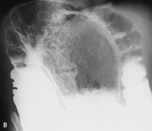 Esophageal dilation due to decreased peristalsis. ‘Hidebound’ small bowel: increased frequency of thin, straight folds, typically jejunal (after the onset of skin changes). Marked small bowel dilation, duodenum and jejunum. Pseudosacculations on antimesenteric side if small bowel. Can have benign pneumatosis (pneumatosis cystoides coli) and/or free air. Constipation/fecal retention.